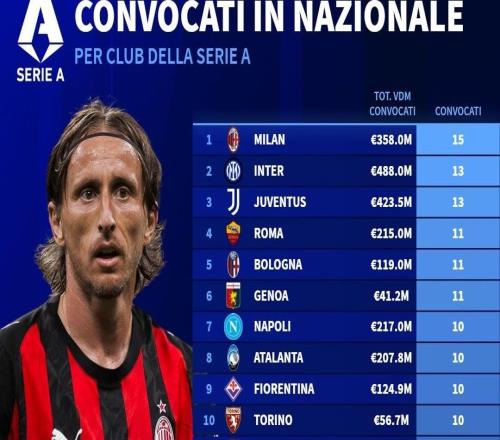 北京时间10月8日,德转统计出了意甲球队本月国际比赛日被征召的球员人数,AC米兰15人得到征召排名第一,国际米兰...