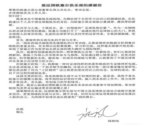 阎相闯把这段宝贵的经历当成教练生涯中永不枯竭的财富。并承诺:“我将不辜负欧塞尔的慷慨与教诲,将学到的知识带回中国,融入到未来的工作中,努力培养更多有技术、有头脑、有创造力的年轻球员。”那么,如何报答欧塞尔俱乐部?有球迷调侃:“向欧塞尔推荐一下中超神锋马莱莱、真核拉布亚德!”