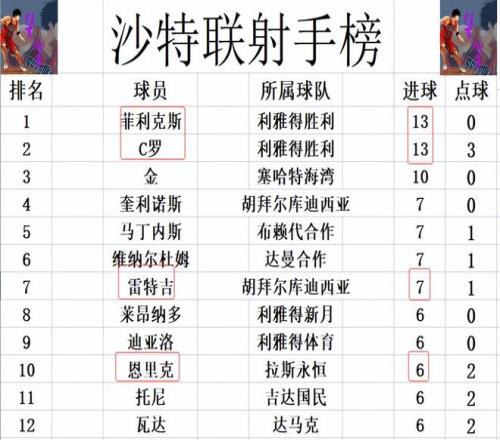 射手榜方面,利雅得胜利的葡萄牙双枪继续领跑,C罗,菲利克斯13球并列榜首。金10球排在第2,雷特吉追上维纳尔杜姆,马丁内斯,7球并列第4。恩里克点射打入一球,追上莱昂纳多,托尼,6球刚好挤入前十。