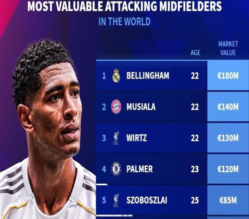 在完成最新一次身价更新后,德国转会市场网站列出了进攻型中场身价榜,贝林厄姆以1.8亿欧居首,穆西亚拉以1.4亿欧...